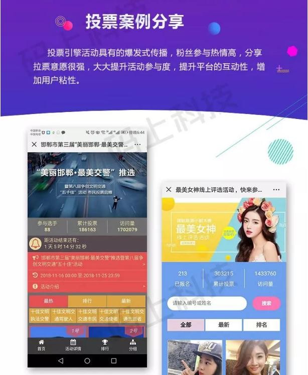 投票活動能最大程度地激發大伙的競爭意識,讓參與者通過微信圈好友轉發讓越來越多的人參與進來。例如,萌娃,萌寵,攝影,服裝,美食,婚紗,優秀員工等各行各業的投票評選活動,是你推廣產品,公眾號吸粉,營銷宣傳的第一選擇。而在幫自家選手拉票的同時,企業廣告也能通過社交渠道得到最大程度的曝光。投票活動在帶動用戶參加的同時,還可以吸引更多的微信粉絲。