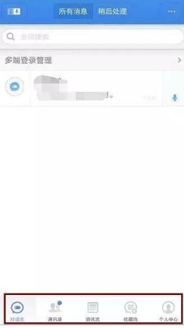 首頁進去主要是消息管理,底部菜單分為對話、通訊錄、資訊、收藏和個人中心。