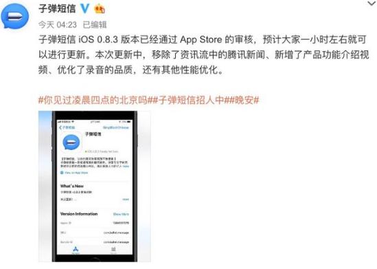 8月29日消息,凌晨4點(diǎn)子彈短信官方微博發(fā)文:子彈短信iOS0.8.3版本已經(jīng)通過AppStore的審核。本次更新中,移除了資訊流中的騰訊新聞、新增了產(chǎn)品功能介紹視頻、優(yōu)化了錄音的品質(zhì),還有其他性能優(yōu)化。