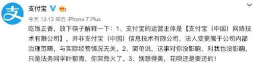 1、支付寶的運營主體是【支付寶(中國)網絡技術有限公司】,并非支付寶(中國)信息技術有限公司,法人變更屬于公司內部治理范疇,與實際經營情況無關。