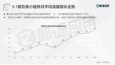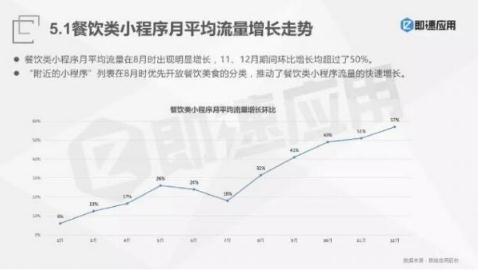 從即速應(yīng)用發(fā)布的2017年小程序發(fā)展報告的總結(jié)中發(fā)現(xiàn),餐飲類小程序月平均流量在2017年9月時出現(xiàn)翻倍增長,11、12月期間環(huán)比增長均超過了50%。目前相信餐飲小程序依然存在大幅增長。