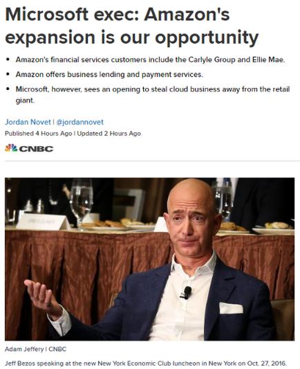 北京時間 9 月 10 日凌晨,據 CNBC 報道,微軟近期表示亞馬遜進軍多種業務是給了微軟一個“竊取”其云服務市場的大好機會。原因之一是這些行業內大多數想要使用云服務的公司不會想要使用競爭對手提供的服務。