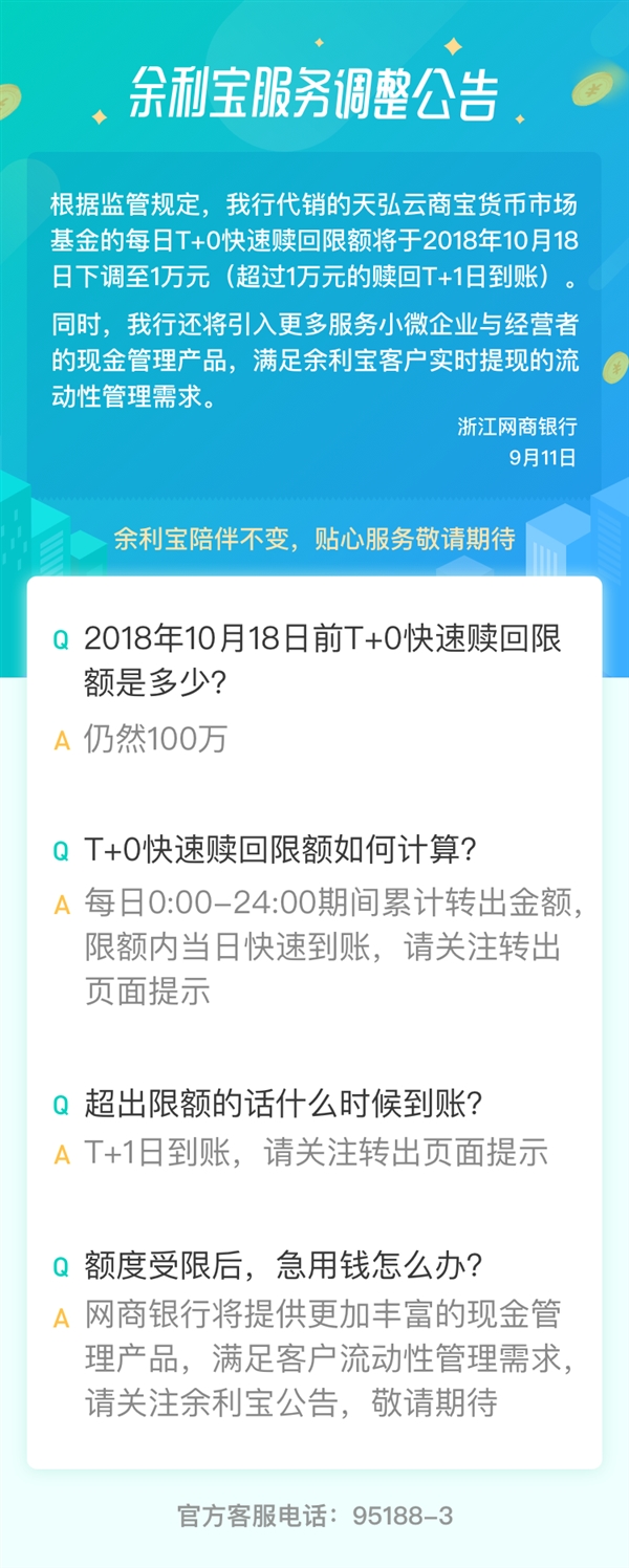 今天,支付寶發布公告,宣布調整余利寶服務,個人用戶每日T+0(即交易日當日)快速贖回金額將從 2018 年 10 月 18 日開始,從目前的 100 萬元下調到 1 萬元。屆時,超過 1 萬元的贖回將在T+1 日(即下一個交易日)到賬。