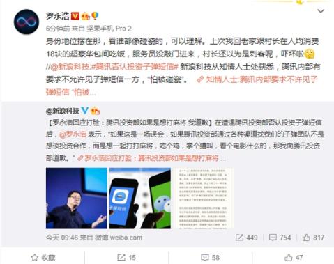 此外,羅永浩針對“騰訊要投資子彈短信一事”作出回應(yīng):由于我們團(tuán)隊(duì)的人生性愚鈍,還喜歡自作多情,加上八月二十一號開始找我們的 50 多家機(jī)構(gòu),都是各種投資基金和大企業(yè)的投資部來談投資再加上對方是騰訊投資部的,而不是“騰訊融資部”的,所以我們把這個(gè)理解成了騰訊是想談投資合作的可能性。
