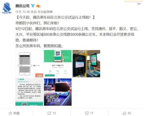 騰訊官方微博宣布,騰訊乘車碼在北京公交試運行上線,目前騰訊乘車碼支持通州、昌平、順義、密云、大興、平谷等區域500余條公交線路5000余輛公交車。