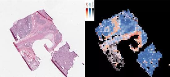 ▲上圖為 AI 模型從癌變組織圖像中識別兩種肺癌類型的示意圖。其中左圖為原始圖像,右圖為 AI 輸出的肺癌類型圖譜。右圖中的紅色部分為鱗狀細胞癌,藍色部分為肺鱗狀細胞癌,灰色部分為正常肺部組織(圖片來源:NYU School of Medicine)