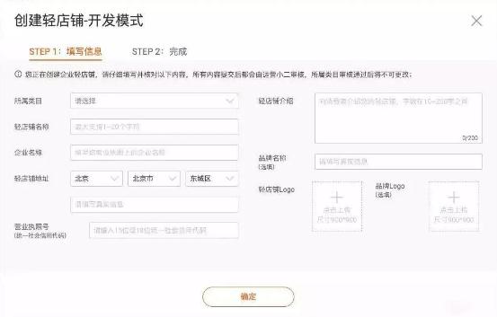 2. 創建輕店鋪,選擇正確的服務類目,上傳資質「目前僅支持開發模式,通過模板創建方式敬請期待」;