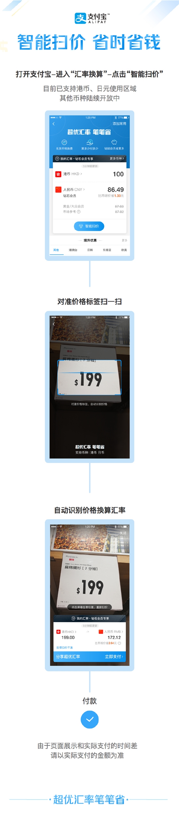 為了方便出境游客,支付寶里新推了“智能掃價”功能,從支付寶-匯率換算進入,打開“智能掃價”,掃一掃商品價格標簽,就能自動計算以支付寶付款的價格結果。