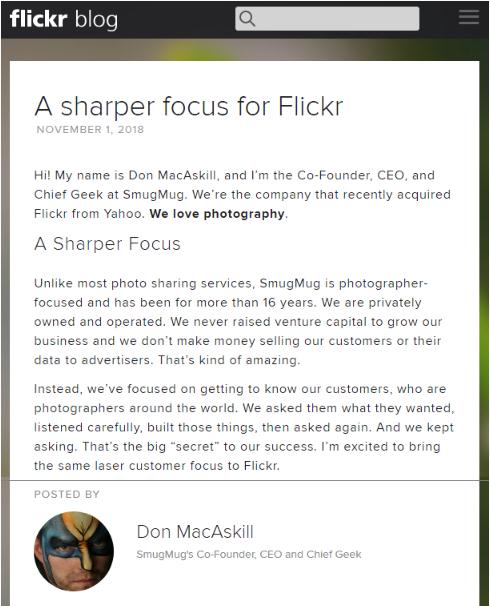 Don MacSkill 在最近的一篇博客文章中寫到:“經歷了戰略起步之后,追逐成為熱門社交媒體的時代已經過去,今后 Flickr 的戰略將主要面向攝影和攝影師”。