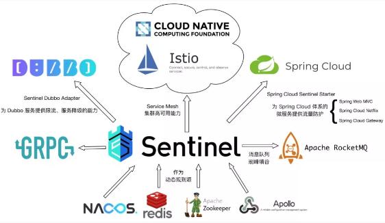Sentinel 的開源生態非常廣泛,其針對常用的框架和庫進行了適配,包括 Web Servlet、Dubbo、Spring Cloud 和 gRPC 等,用戶只需引入相應依賴并進行簡單配置即可快速接入 Sentinel。同時,Sentinel 動態規則源針對常見的配置中心和遠程存儲進行適配,目前已支持 Nacos、ZooKeeper、Apollo、Redis 等多種動態規則源,可以覆蓋到很多的生產場景。未來,Sentinel 還會對更多常用框架和配置中心進行適配,覆蓋更廣泛的場景。