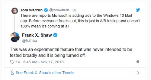 “與 Outlook.com,Gmail 和 Yahoo Mail 等消費(fèi)者電子郵件應(yīng)用和服務(wù)一致,廣告使我們能夠提供支持和改進(jìn)我們的某些產(chǎn)品。我們一直在嘗試新的功能和體驗(yàn)。目前,我們在巴西,加拿大,澳大利亞和印度進(jìn)行了測試,以獲取用戶對 Mail 廣告的反饋,“微軟解釋道。