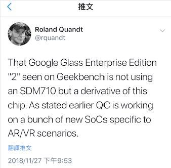 昨日晚間,Roland Quandt 在社交媒體上透露,在 GeekBench 跑分測(cè)試中現(xiàn)身的第二代企業(yè)版谷歌眼鏡的產(chǎn)品上,所使用的并非驍龍 710 芯片,而是一款高通專門針對(duì) AR/VR 場(chǎng)景而設(shè)計(jì)的芯片。