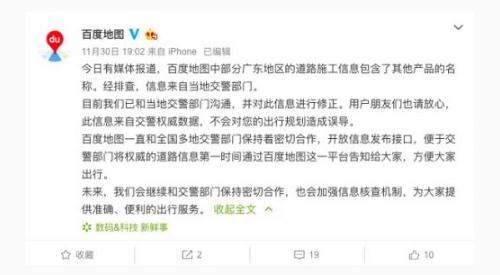 百度地圖稱,自己一直和全國多地交警部門保持著密切合作,開放信息發(fā)布接口,便于交警部門將權(quán)威的道路信息第一時間通過百度地圖這一平臺告知給大家,方便大家出行。未來,我們會繼續(xù)和交警部門保持密切合作,也會加強信息核查機制,為大家提供準確、便利的出行服務(wù)。