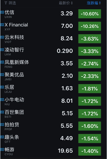 另一方面,跌幅較大的公司包括:優信(跌 10.60%)、小贏科技(跌 10.26%)、云米科技(跌 3.63%)、凌動智行(跌 3.33%)、鳳凰新媒體(跌 2.74%)、聚美優品(跌 2.33%)。