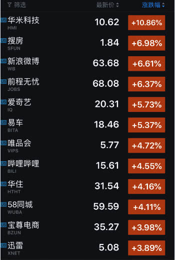 中國概念股多數上漲,其中漲幅較大的公司包括:華米科技(漲 10.86%)、搜房(漲 6.98%)、新浪微博(漲 6.61%)、前程無憂(漲 6.37%)、愛奇藝(漲 5.73%)、易車(漲 5.37%)、唯品會(漲 4.72%)、嗶哩嗶哩(漲 4.55%)、華住(漲 4.16%)、58 同城(漲 4.11%)、寶尊電商(漲 3.98%)、迅雷(漲 3.89%)、歡聚時代(漲 3.61%)、新浪(漲 3.47%)、陌陌(漲 3.29%)、汽車之家(漲 3.29%)、團車網(漲 3.21%)、瑞思教育(漲 3.18%)。