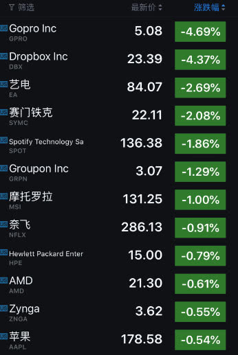 另一方面,跌幅較大的公司包括:Gopro(跌 4.69%)、Dropbox(跌 4.37%)、藝電(跌 2.69%)、賽門鐵克(跌 2.08%)、Spotify(跌 1.86%)、Groupon(跌 1.29%)、魔頭羅拉系統(跌 1.00%)。