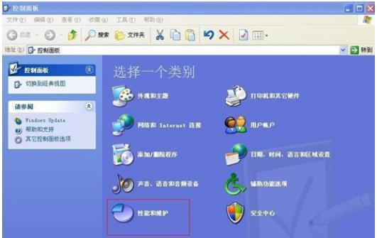單擊“控制面板”之后會彈出如圖對話框,這時我們單擊對話框里面的“性能和維護”按鈕。