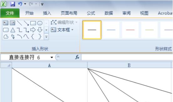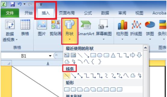 在excel軟件主界面,切換到“插入”選項卡下, 選擇“形狀”-“線條”,在其中找到你需要的斜線的樣式,一般都是普通直線,如下圖所示: