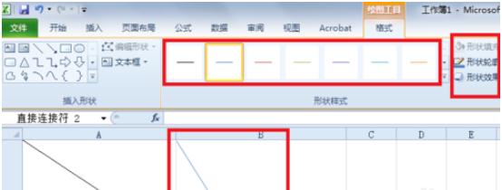 選擇直線確定后,直接在要插入斜線的單元格內(nèi)畫線即可,并可以選擇“形狀輪廓”和“形狀效果”,如下圖所示: