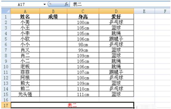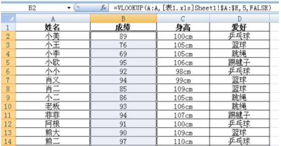 如下圖兩個(gè)表格,表一為數(shù)據(jù)量更大的表格包含了表二的部分?jǐn)?shù)據(jù)信息,表二需要從表一中得到指定一部分姓名的成績。使用VLOOKUP函數(shù)前首先要確定表一中姓名是在需要引用的成績所在列的前面。