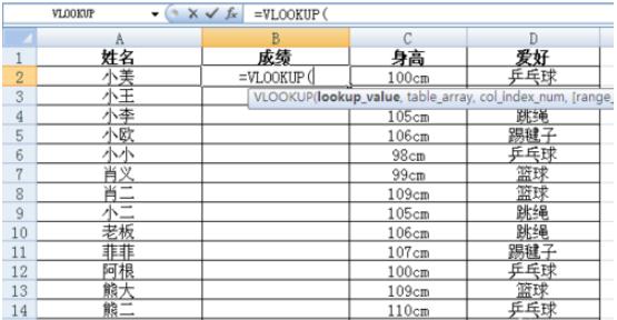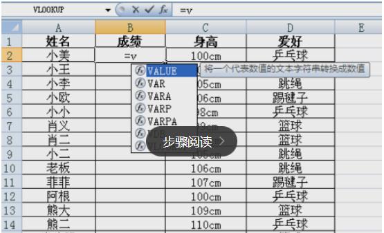 下面開始使用函數(shù)查找,在英文輸入法的狀態(tài)下,在表二需要填充數(shù)據(jù)列“成績”的第一個(gè)單元格處輸入“=v”,出現(xiàn)一列函數(shù)后,雙擊選擇VLOOKUP。