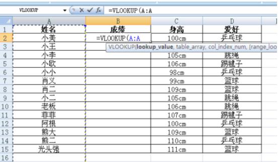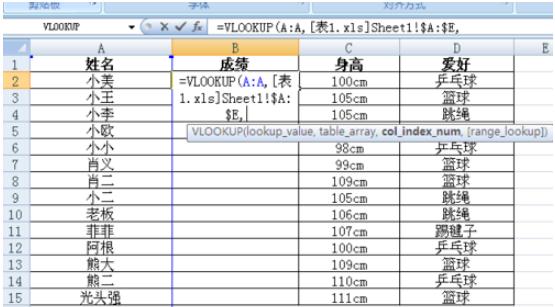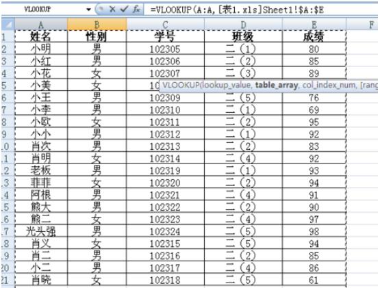 然后選擇你要查找成績的依據(jù)條件列,如表二是根據(jù)姓名來查找成績,所以這里需要選擇表二的姓名所在列作為第一個(gè)參數(shù)(如下圖),接著輸入一個(gè)逗號。