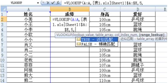 然后在函數(shù)光標(biāo)處再輸入一個(gè)數(shù)字作為第三個(gè)參數(shù),這個(gè)數(shù)字是代表我們要引用數(shù)據(jù)的表一成績欄在我們剛剛所框選的范圍的第幾列,我們這里是第五列,就是輸入“5”,接著再輸入一個(gè)逗號(出現(xiàn)下圖),雙擊精準(zhǔn)匹配。