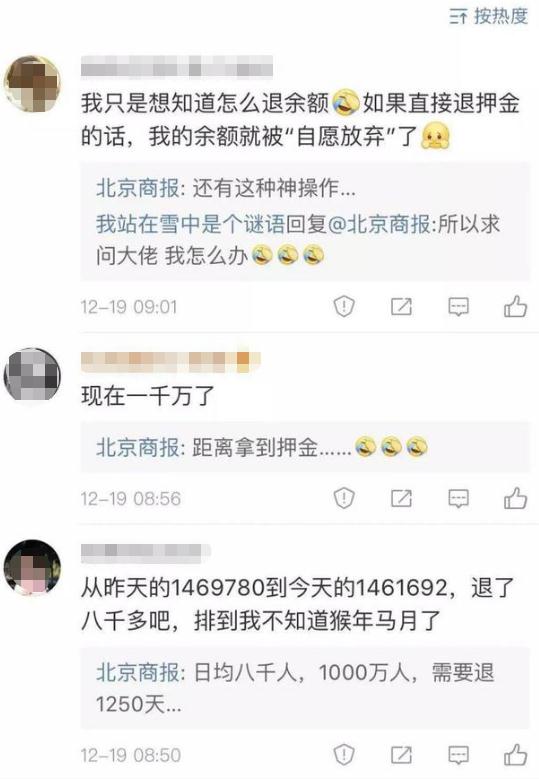 但追問到底最晚什么時候能退時,工作人員卻表示無法確定,并解釋稱 18 日開始線上排隊退押金。每天零點都會退一批人,剩下的人則會順延到前面。