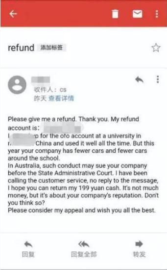 近日,網友@zjt93 發微博稱,通過假裝是一名來自加州、在中國生活了兩三年、中文不太好、做事喜歡上綱上線的外國人,在給 ofo 寫了封投訴郵件后很快收到了退的押金,ofo 還回復了一封英文郵件道歉。