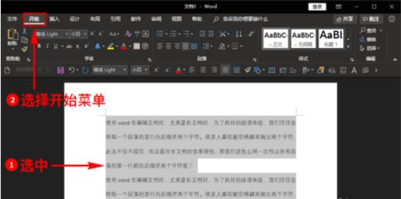 打開后,我們選中文檔中需要第一行向后縮進(jìn)兩個字符的所有文檔,然后在頂部的菜單欄中找到并點擊“開始”菜單。