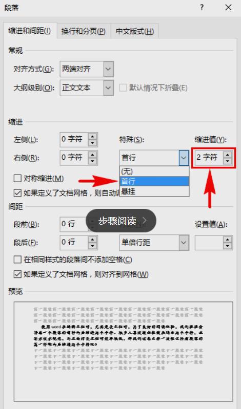 在“縮進(jìn)”欄目組里我們找到“特殊”選項,將特殊設(shè)置為“首行”,然后將后面的“縮進(jìn)值”設(shè)置為“2字符”。