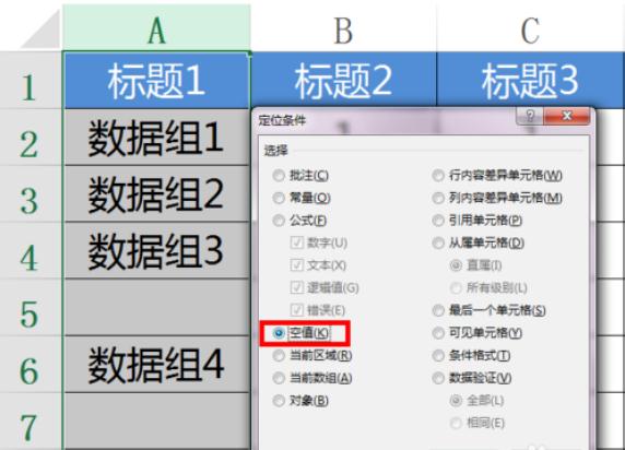 在定位條件頁面,點(diǎn)擊選擇"空值",然后點(diǎn)擊"確定"。