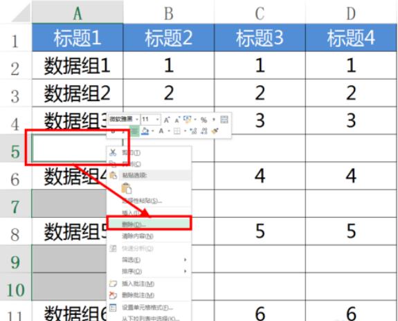 將鼠標(biāo)光標(biāo)移至選中的第一個空白單元格上方(注意:此時不要隨便使用鼠標(biāo)胡亂點(diǎn)擊),鼠標(biāo)右鍵單擊,點(diǎn)擊"刪除"。