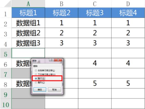 在刪除選項(xiàng)中,點(diǎn)擊選擇刪除"整行",即可完成刪除空白行。