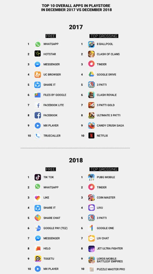 上述報告援引 Sensor Tower 的數據稱,在印度排名前十的 Android 應用中,有 5 款款應用程序來自中國;相對而言,在 2017 年底,在印度排名前十的 Android 應用中,只有 2 款應用程序來自中國。