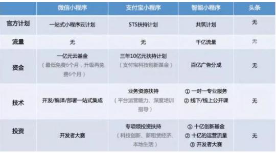 從現實來說,對于小程序這一戰略級產品,除開今日頭條,BAT三大平臺事實上都拿出了自己的開發者扶持計劃。