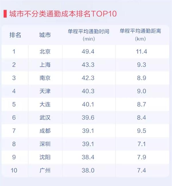 如果按照不分類通勤成本來看,排名前十的城市依次是:北京、上海、南京、天津、大連、武漢、成都、深圳、沈陽、廣州。