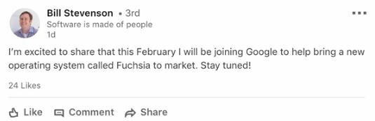 據外媒報道,谷歌已經聘請了有著 14 年經驗的資深工程師 Bill Stevenson 來操盤 Fuchsia,目標是推向成熟市場。