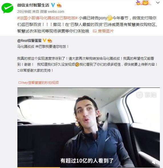1 月 24 日消息,去年一個法國小哥@Real 信誓蛋蛋的視頻在微博上刷屏,該法國小哥希望微信支付能去拯救落后的法國。今天他再發(fā)微博稱,法國現(xiàn)在已能實現(xiàn)微信支付,還表示如果馬化騰來巴黎要請他吃飯!