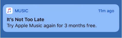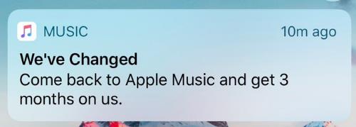 在過(guò)去一周中,蘋果向大量iOS用戶發(fā)出推送消息,提供給用戶額外的3個(gè)月AppleMusic免費(fèi)試用。這些消息似乎是專門為那些AppleMusic老用戶準(zhǔn)備的,這些用戶曾經(jīng)訂閱了AppleMusic,但后來(lái)取消了訂閱,或者是經(jīng)過(guò)第一次3個(gè)月免費(fèi)試用后,沒(méi)有選擇訂閱而直接離開(kāi)的。