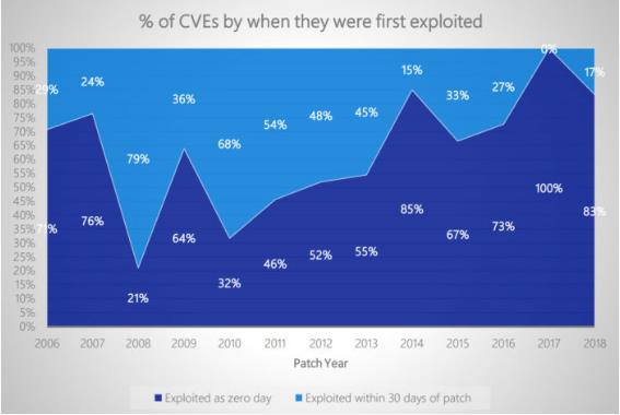這說明了微軟的安全部門工作起到了作用,且微軟像DEP,ASLR和改進的沙盒等的安全功能運行效果良好。過去的幾年,在Windows分發(fā)補丁的30天內,漏洞被利用的比例只占2%到3%,在這期間內發(fā)布非0day漏洞現在也變得不常見。