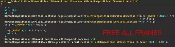 在 CVE-2019-0797 中有易受攻擊代碼獲得了和 DirectComposition::CConnection 結構中幀操作相關的一個鎖,而且試圖找到和既定 id 相對應的幀并最終調用釋放 (free) 。這種操作存在的問題可見如下圖: