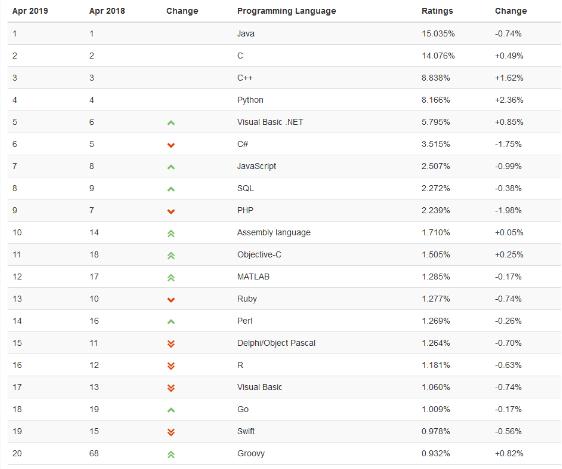 TIOBE 公布了 2019 年 4 月編程語言排行榜,總體排名變化不大,排名前十的分別是:Java, C, C++, Python, Visual Basic .NET, C#, JavaScript, SQL, PHP 和匯編語言。