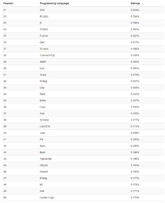 4th Dimension/4D, ABC, ActionScript, Alice, Avenue, BBC BASIC, bc, Bourne shell, C shell, CL (OS/400), Clipper, CoffeeScript, Common Lisp, Crystal, Elixir, Emacs Lisp, Factor, Forth, Hack, Haxe, Icon, Inform, Io, J#, Korn shell, LiveCode, Maple, Mercury, Monkey, MQL4, MS-DOS batch, NATURAL, OpenCL, OpenEdge ABL, PL/I, PostScript, PowerShell, Pure Data, Q, Red, Ring, RPG, S, Snap!, SPARK, Tcl, Tex, Vala/Genie, VBScript, VHDL