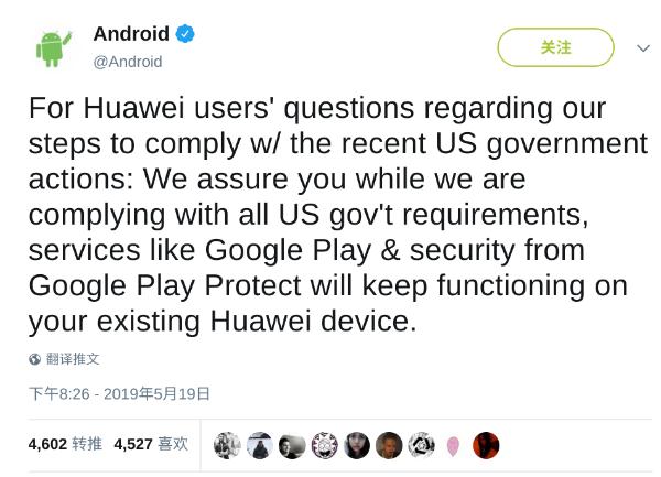 中午 Android 官方正式確認了該消息,Android 推特帳號發布了一條動態(上圖),正面回應了該事件:回應華為用戶關于我們遵守美國政府近期行動的問題:我們向您保證,在我們遵守美國政府的所有要求的同時,Google Play Protect 的 Google Play 和安全等服務將繼續在您現有的華為設備上運行。