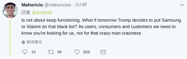 值得一提的是,華為被禁一事,似乎不僅國人在擔憂,比如 Android 賬號這條推特下有許多外國人都對該事件表示不解與反對。其中最熱的一條留言表示:“問題的關鍵不是服務還能不能用。如果明天特朗普決定將三星或小米列入黑名單呢?作為用戶、消費者和客戶,我們需要知道你們在乎的是我們的感受,而不是那個瘋子的。”