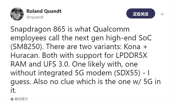 知名爆料人士 Roland Quandt 透露,高通驍龍 865 旗艦平臺內部代號是 SM8250,它將分為兩個不同的版本,其中一版代號為 Kona,另一版代號為 Huracan,它們都將支持 LPDDR5X 內存及 UFS 3.0 閃存,二者區別在于一款集成了高通驍龍 5G 調制解調器,另一款則沒有。