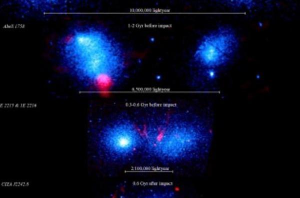 北京時間 6 月 27 日消息,一個研究小組在對兩個即將發(fā)生相撞的星系團結(jié)構(gòu)進行研究后,于是進入發(fā)表論文,認為當(dāng)星系相撞發(fā)生時,可能會產(chǎn)生溫度高達 1 億攝氏度的沖擊波。