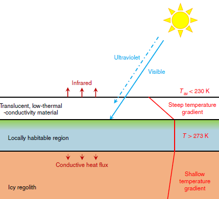 美國哈佛大學的 Robin Wordsworth 及同事在實驗室中復制了火星表面條件,并且表明2-3 厘米的氣凝膠層可以使火星表面溫度上升 50 °C。作者還利用火星氣候模型證實,在富冰溫帶地區,氣凝膠可以使火星終年維持幾米深的液態水。此外,氣凝膠可以在傳播可見光的同時吸收紫外波段的光,這樣既能保護火星表面的環境,也能提供充足的光照支持光合作用。