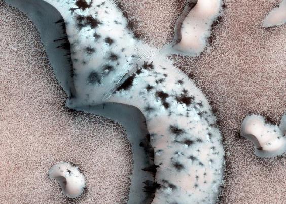 火星上的冰蓋是由水冰和凍結的二氧化碳結合而成的,這與地球上由水冰構成的冰蓋是不一樣的。與氣態的二氧化碳一樣,凍結的二氧化碳在讓陽光穿透時也會將熱量困住。在夏天,這種固態的溫室效應會在冰層下導致小范圍的升溫。